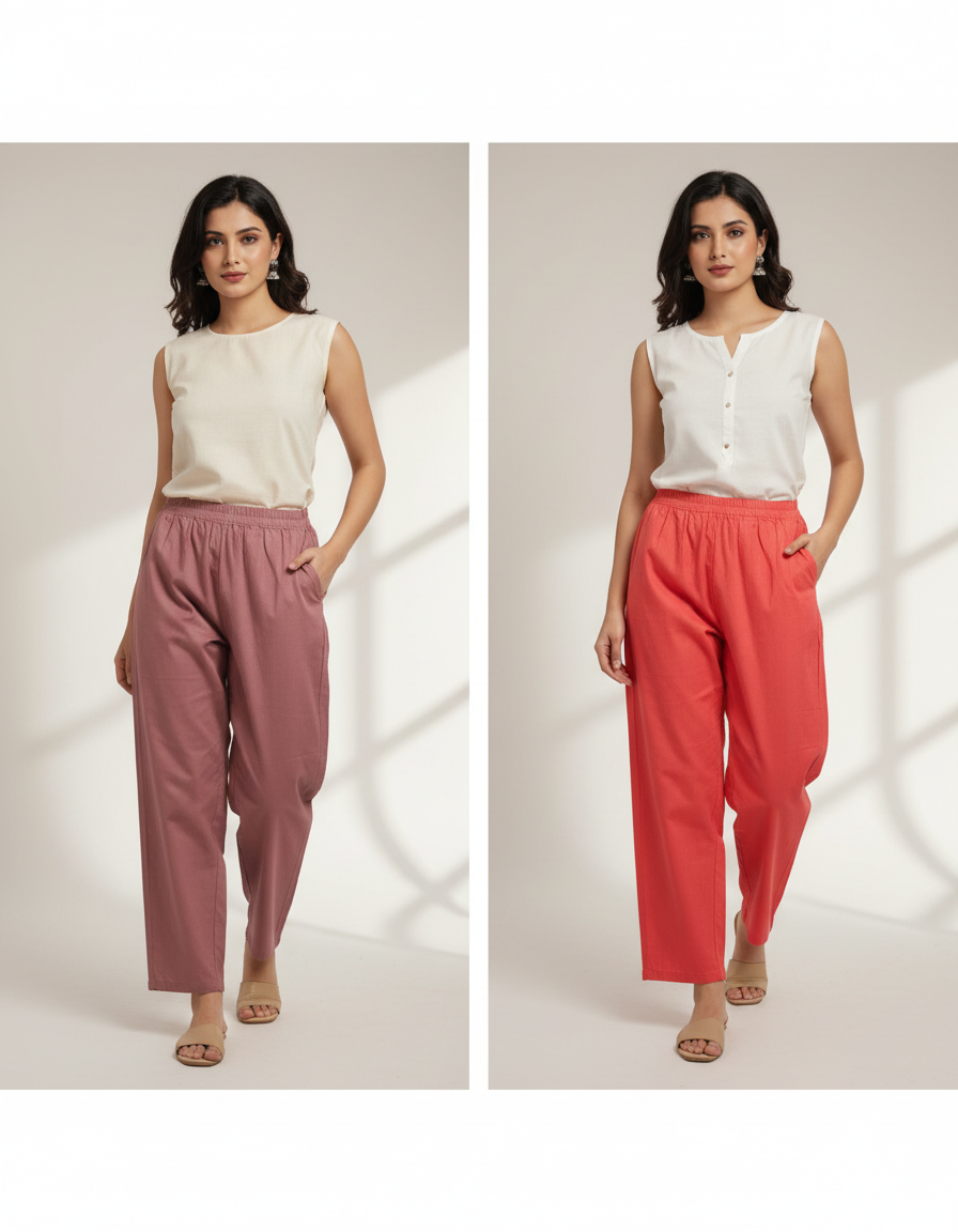 LYCRA COTTON PLAZZO PACK OF 2 DIFFERENT COLOUR PINK, KANKAMRAL SIZE XL TO 4XL SIZE AVELEBLE FULL LENGHT PLAZO WITH SIDE POCKET COMPLETE INTERLOCK
