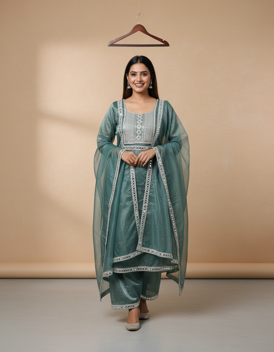 ORGANZZA 3PICE READYMADE SUIT WITH FULL LENGHT PAINT WITH MIRROR WORK LACE